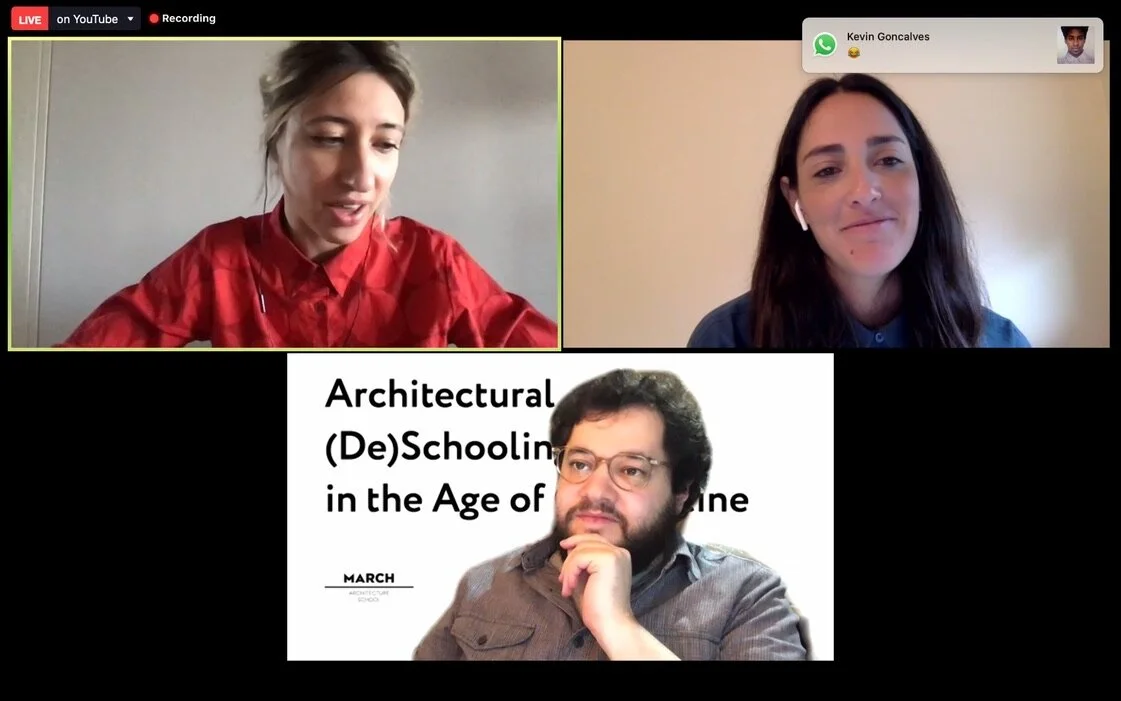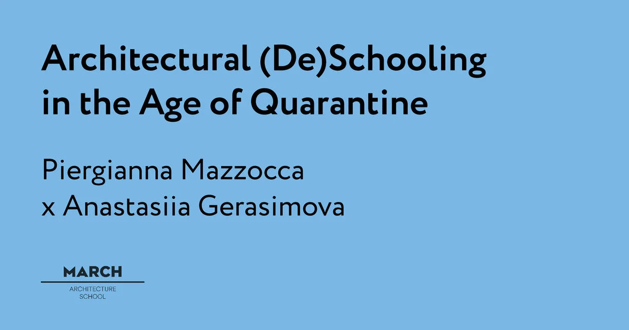 Talk upon the Architectural (De)Schooling in the Age of Quarantine with Piergianna Mazzocca, moderated by Alexander Ostrogorsky —https://www.youtube.com/watch?v=x3KUFUZcXQk&fbclid=IwAR3CMWLVM5JdbZ10qlj33kVtKtHMVpGLljJiG8grsVE0qS9BDe744ROzjQE